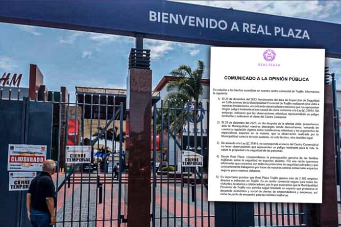 El Centro Comercial Real Plaza se pronunció sobre el cierre de sus instalaciones por parte de la Municipalidad Provincial de Trujillo (MPT) indicando que esta se realizó de forma indebida, puesto que, las observaciones realizadas carecen de sustento técnico y legal, porque las conexiones eléctricas no presentan riesgos para la población.