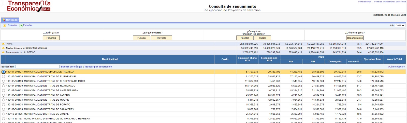 El sentenciado y suspendido alcalde de Trujillo, Arturo Fernández, cerró su primer año de gestión ejecutando apenas el 30.8% de su presupuesto para proyectos, según el portal de Consulta Amigable del Ministerio de Economía y Finanzas.