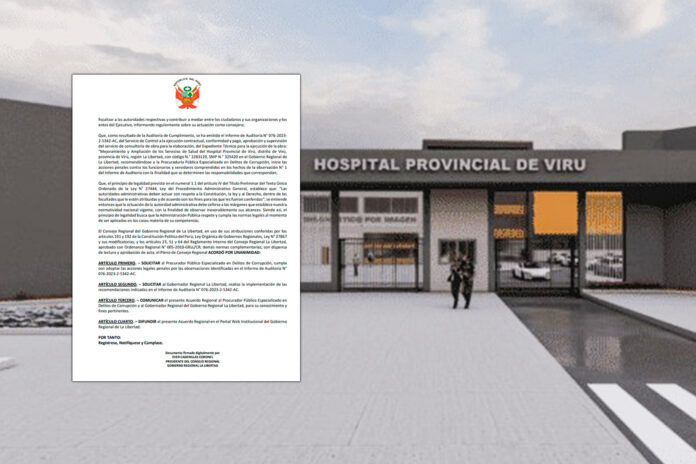 El Consejo Regional de La Libertad, a través del Acuerdo Regional N°09-2024-GRLL-CR, solicita al procurador público especializado en delitos de corrupción que inicie con las acciones legales penales por las observaciones identificadas en el expediente técnico del proyecto “Mejoramiento y Ampliación de los Servicios de Salud del Hospital Virú”.