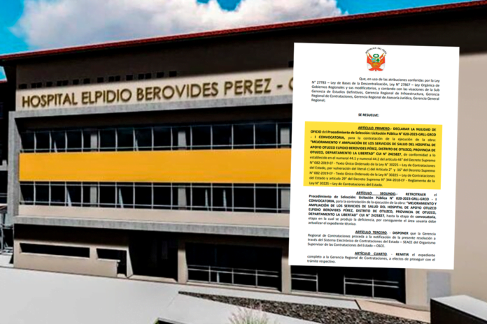 “Declarar la nulidad de oficio del procedimiento de selección: licitación pública N° 020-2023-GRLL-GRCO – I convocatoria, para la contratación de la ejecución de la obra: “Mejoramiento y ampliación de los servicios de salud del Hospital de Apoyo Otuzco Elpidio Berovides Pérez, distrito de Otuzco, provincia de Otuzco, departamento La Libertad”, CUI N° 2425827”, se lee en el documento.