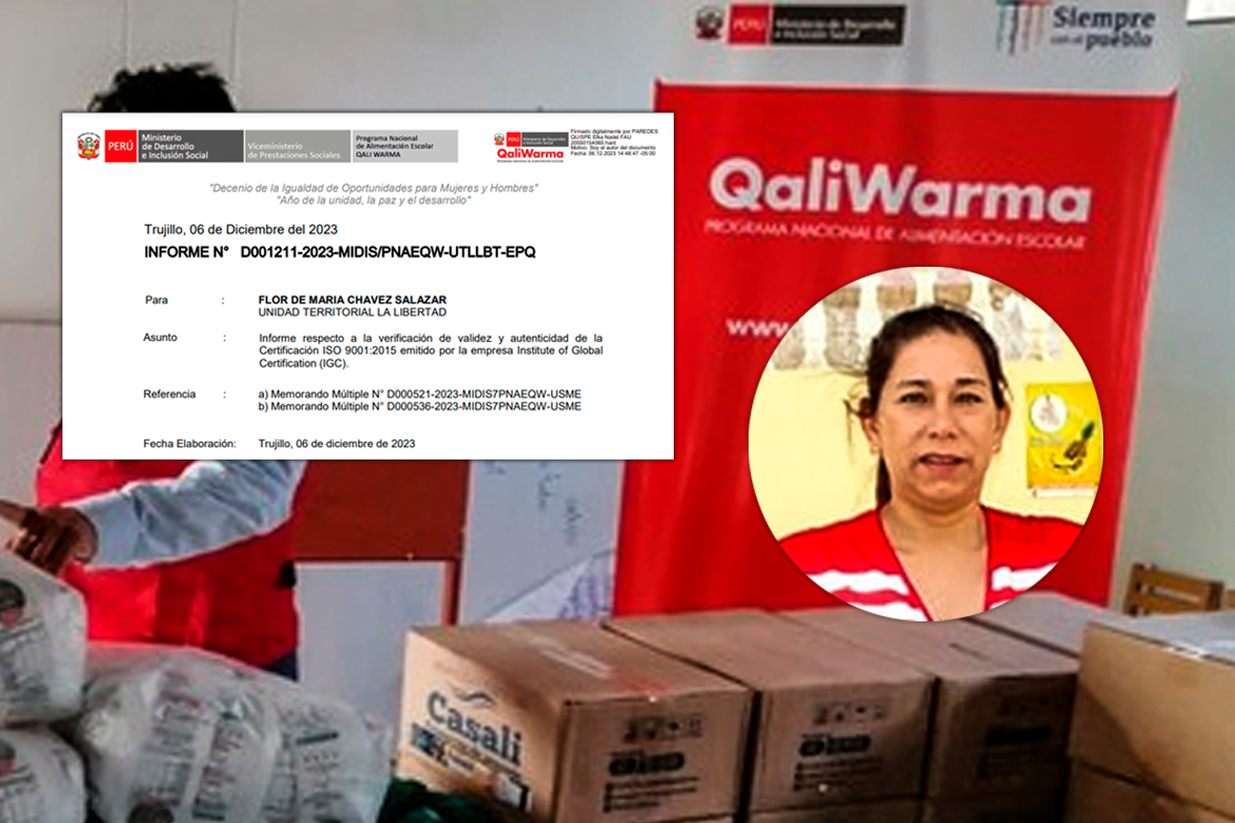 El pasado 05 de diciembre, Elka Paredes Quispe, que por aquella época era la Coordinadora Técnica Territorial Encargada de Qali Warma La Libertad, firmó un informe sobre la validez y autenticidad de la certificación ISO 9001:2015 emitido por la empresa Institute of Global Certification (IGC), donde suscribe lo señalado en el párrafo anterior. Además, detalla que la referida casa certificadora especificó que a nombre del proveedor Quezada Trujillo Hugo Eduardo solo emitió el certificado N° 20-A-3044, el cual se encuentra suspendido y no coincide con el presentado al programa estatal por el contratista. A nombre de DOEMS PERU EIRL, IGC asegura que emitió el certificado N° 21-A-3582, que tampoco coincide con el presentado por la empresa y que sí se encuentra válido. A nombre de ONDAC SRL, la casa certificadora informa haber emitido los certificados N° 21-A-3397 Rev.1 y el N° 21-A-3763, para ser precisos, IGC también aclara que el primero de estos documentos sí fue emitido por ellos y tiene la categoría de válido y el segundo no y está suspendido.
