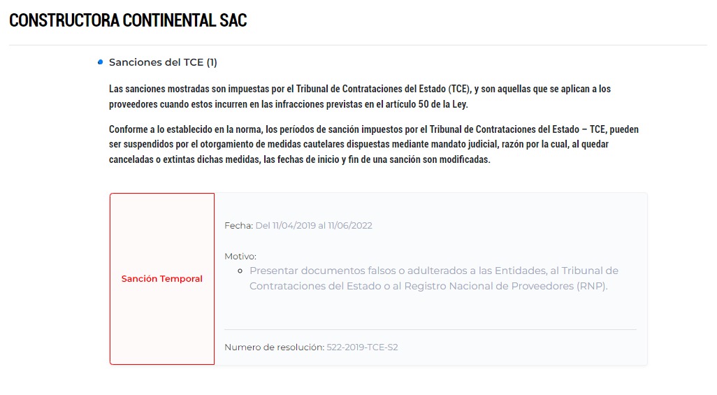 Asimismo, la segunda empresa Constructora Continental SAC, también presenta una sanción temporal que data del 2019 – 2022, por presentar documentos falsos o adulterados.