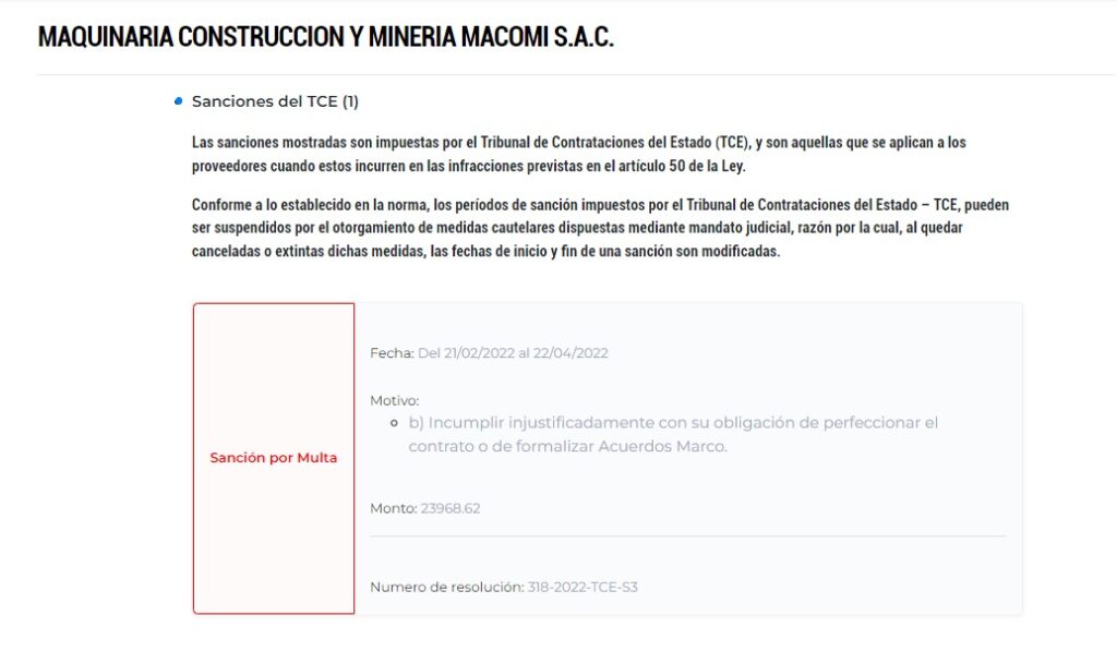La empresa Maquinaria Construcción y Minería Macomi SAC, registra una sanción temporal en el TCE, que data del 2022, por incumplir con su obligación de perfeccionar un contrato