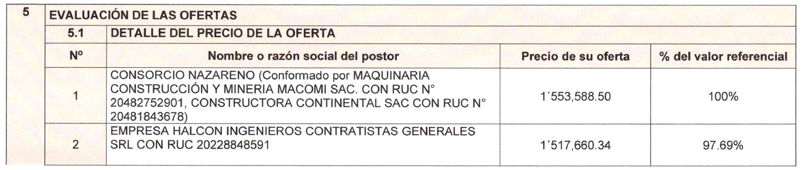 Cabe precisar que el Consorcio Nazareno presentó su precio de oferta al 100% del valor referencial de la obra, mientras que el Consorcio Halcón Ingenieros Contratistas Generales SRL, el cual no ganó la buena pro presentó su precio de oferta al 97% del valor referencial de la obra.