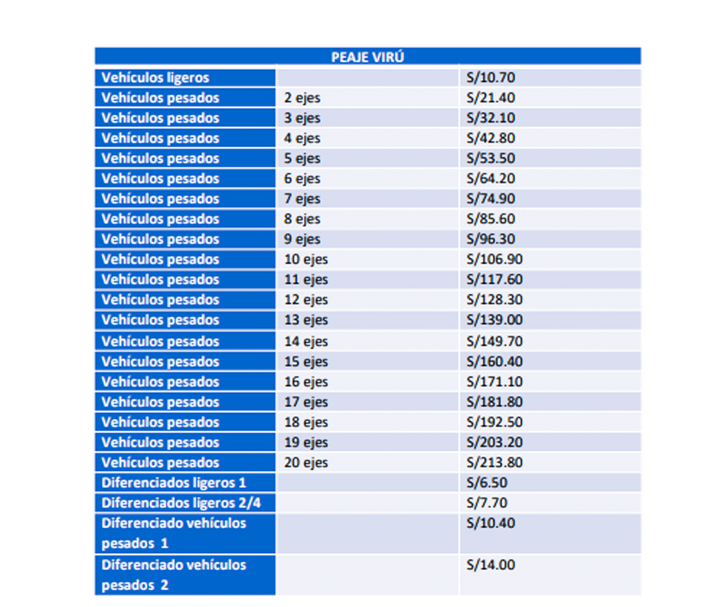 Las nuevas tarifas significan un golpe al bolsillo de miles de transportistas que recorren este tramo de la carretera Panamericana Norte. En el caso de los vehículos ligeros tendrán que pagar un peaje de S/10.70, los vehículos pesados de 2 ejes pagarán ahora S/ 21.40, los de 3 ejes S/ 32.10, los de 4 ejes S/ 42.80, los de 5 ejes S/ 53.50 y así hasta llegar a los vehículos pesados de 20 ejes que tendrán que desembolsar S/ 213.80 en cada una de las estaciones de peaje de AUNOR.