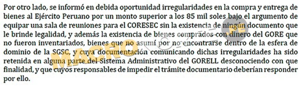 Además, hizo énfasis en precisar que envió documentación de estas irregularidades, pero fue retenida en alguna parte del sistema administrativo del Gore La Libertad, desconociendo su finalidad.