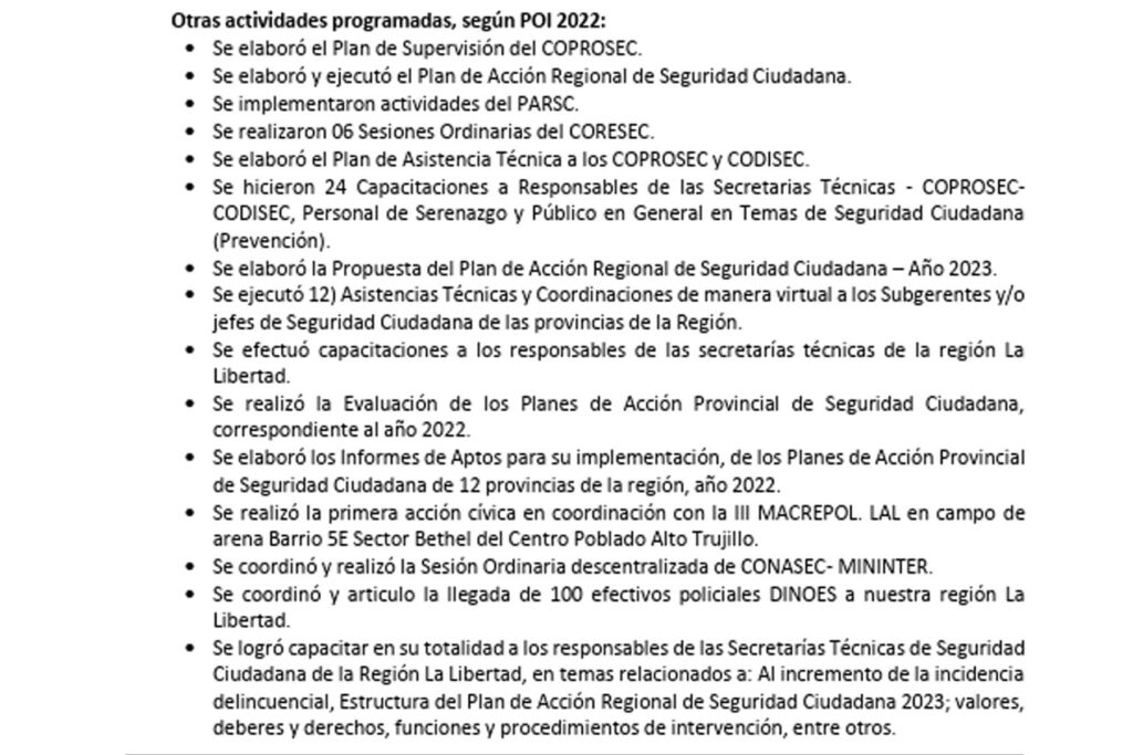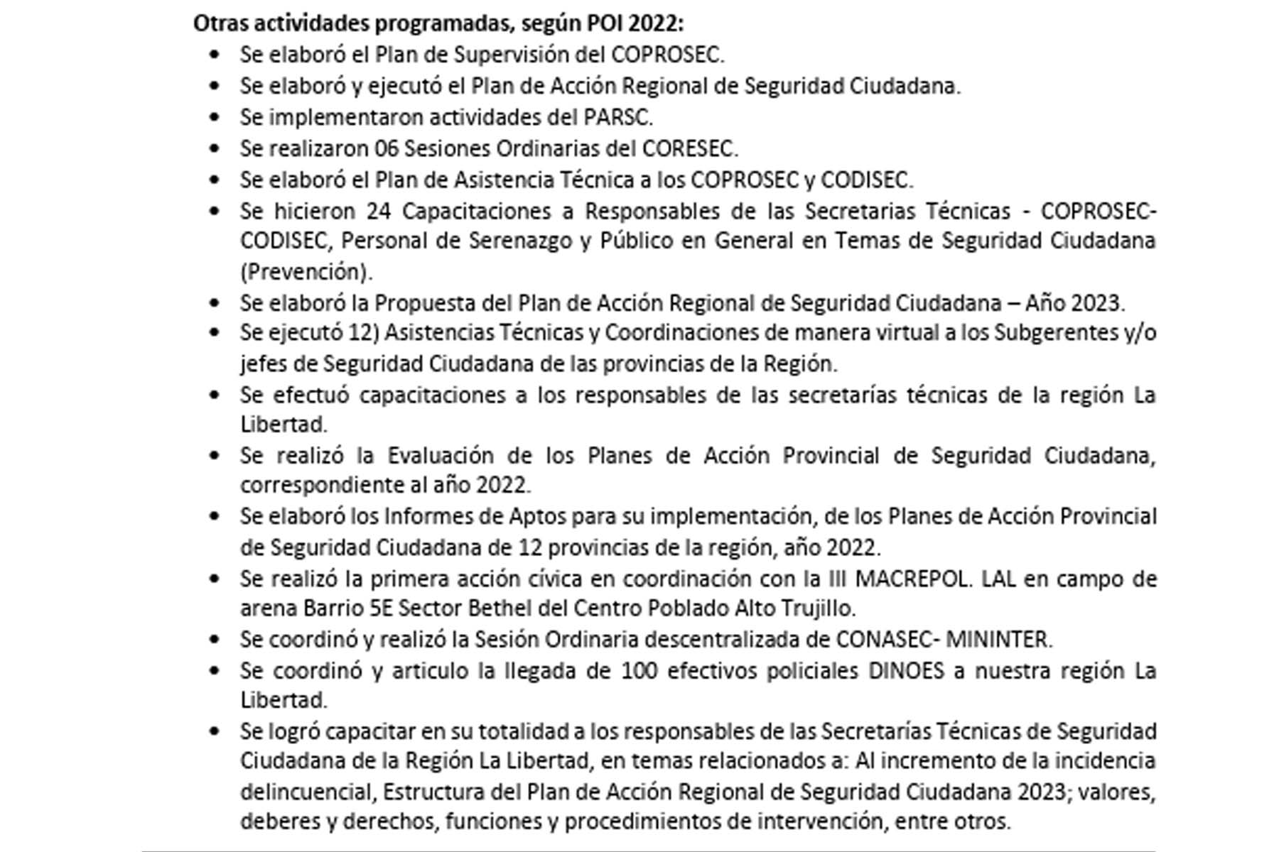 Macronorte.pe accedió a la memoria anual 2022 de la subgerencia de Seguridad Ciudadana del GRLL para verificar si figuraba la compra y entrega de los citados bienes en la sede del Ejército Peruano; sin embargo, se corroboró que esta implementación no estaba detallada dentro del informe.
