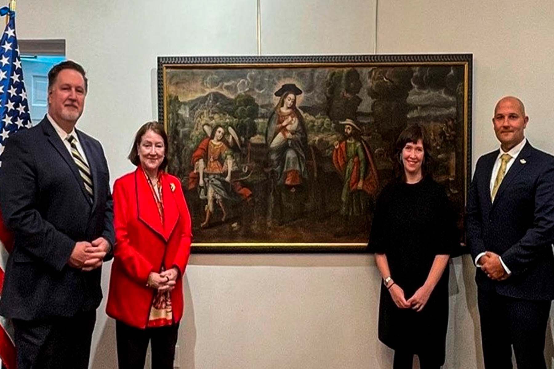 La Oficina de Investigaciones del Departamento de Seguridad Nacional, devolvió dos pinturas religiosas pertenecientes al patrimonio cultural peruano al Cónsul General de Perú en Nueva York, Embajadora Marita Landaveri, durante una ceremonia en la misión diplomática de Perú en Nueva York.