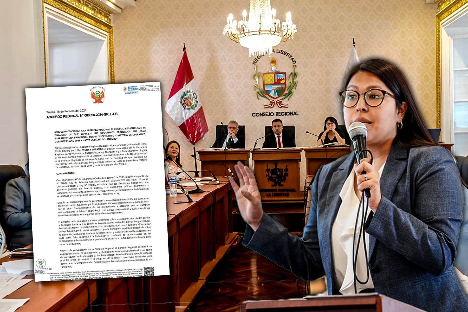 El Consejo Regional de La Libertad, mediante Acuerdo Regional N° 26-2024-GRLL-CR, aprobó invitar a la prefecta regional Carolina Velasco Nalvarte, para que informe de manera detallada los resultados obtenidos en los operativos realizados por cada subprefectura provincial, desde el 2023 hasta la actualidad.