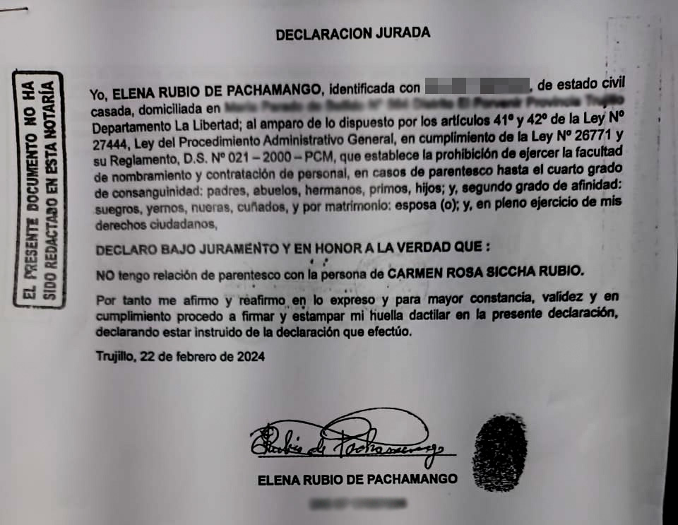 En esa línea, Siccha Rubio rechazó que haya direccionado una orden de servicio a favor de Pachamango Rubio, además, aseveró que la referida mujer no forma parte de su árbol genealógico.