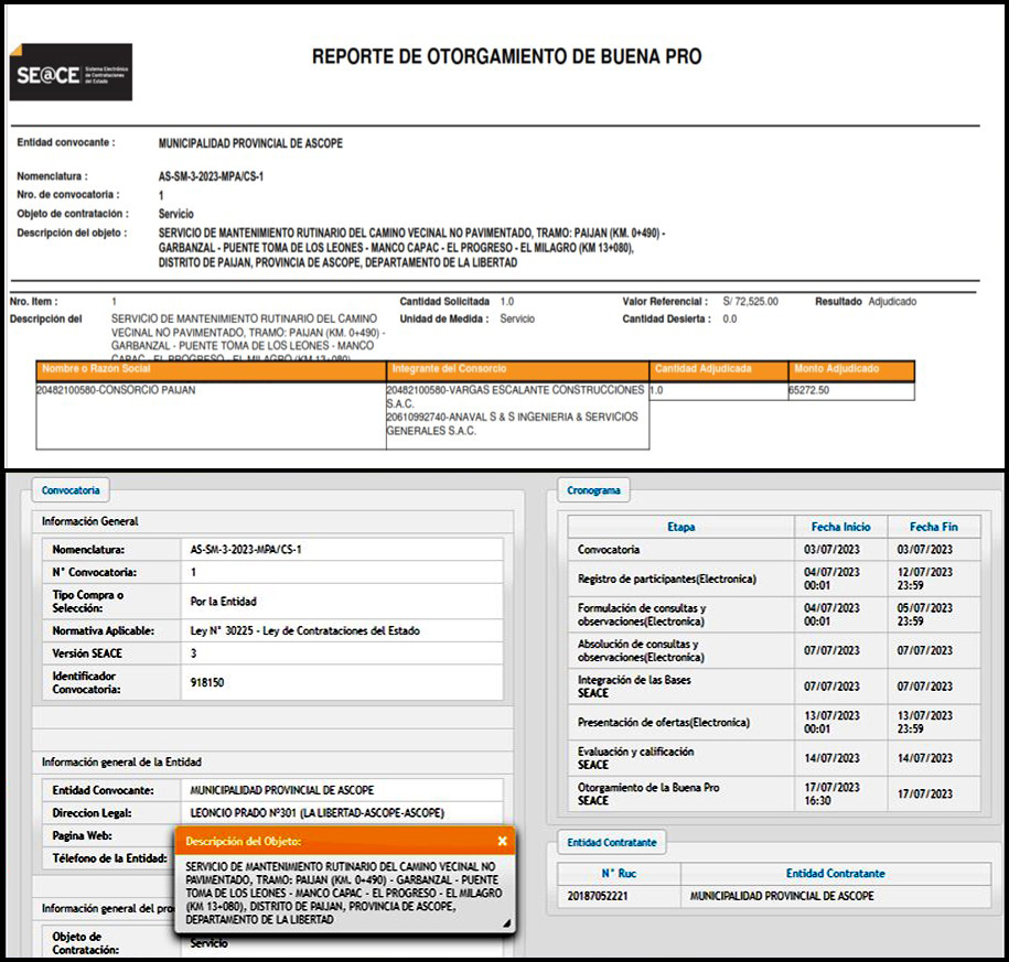 Es así que el municipio y el consorcio integrado por las empresas Aval S & S Ingenieria & Servicios Generales S.A.C. y Vargas Escalante Construcciones S.A.C., firmaron el Contrato de Servicio N° 05-2023-MPA, en agosto de 2023 por un monto de S/65,272.50.