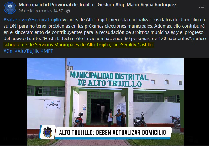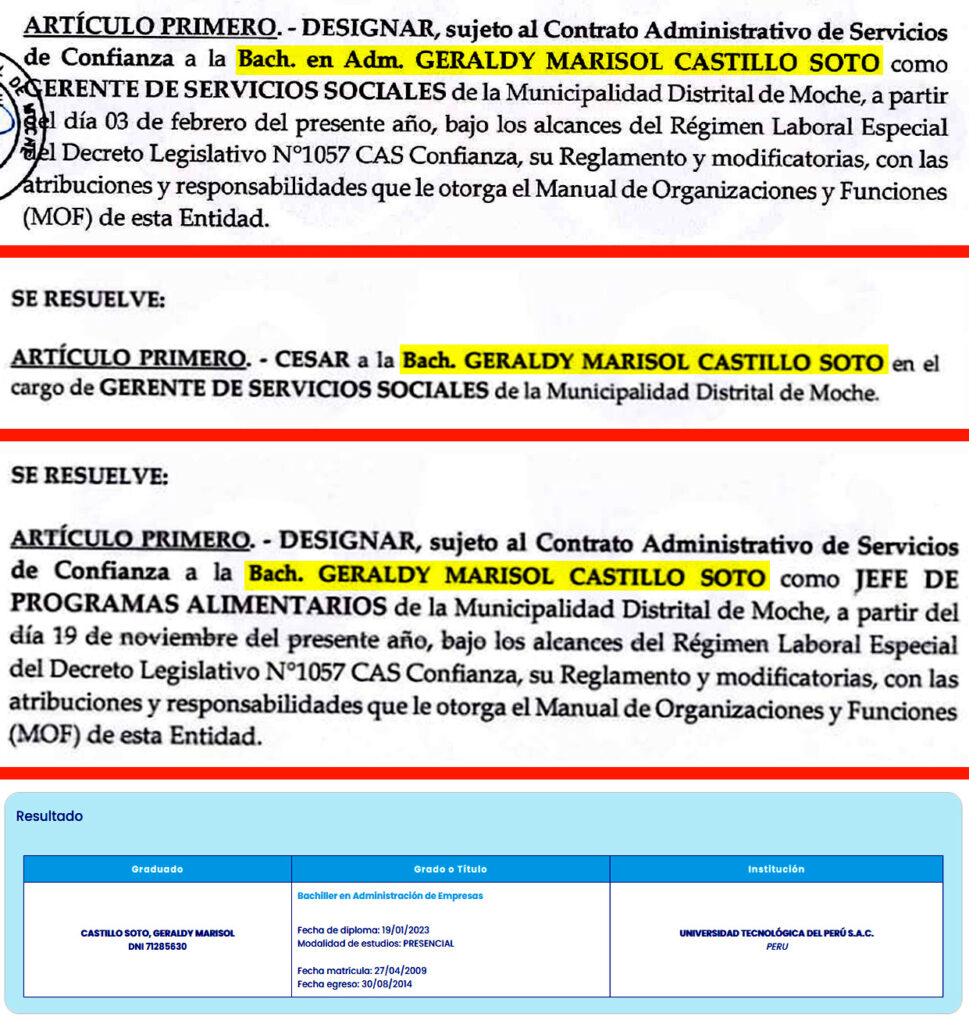 Geraldy Marisol Castillo Soto ocupa la Subgerencia de Servicios Municipales de la Municipalidad Distrital de Alto Trujillo. De acuerdo con algunas versiones, la citada funcionaria es cercana a Diana Tello, exgerente de la Municipalidad Distrital de Moche, quién habría intervenido para su nombramiento en el municipio de Alto Trujillo, donde actualmente ocupa la Gerencia de Desarrollo Social.