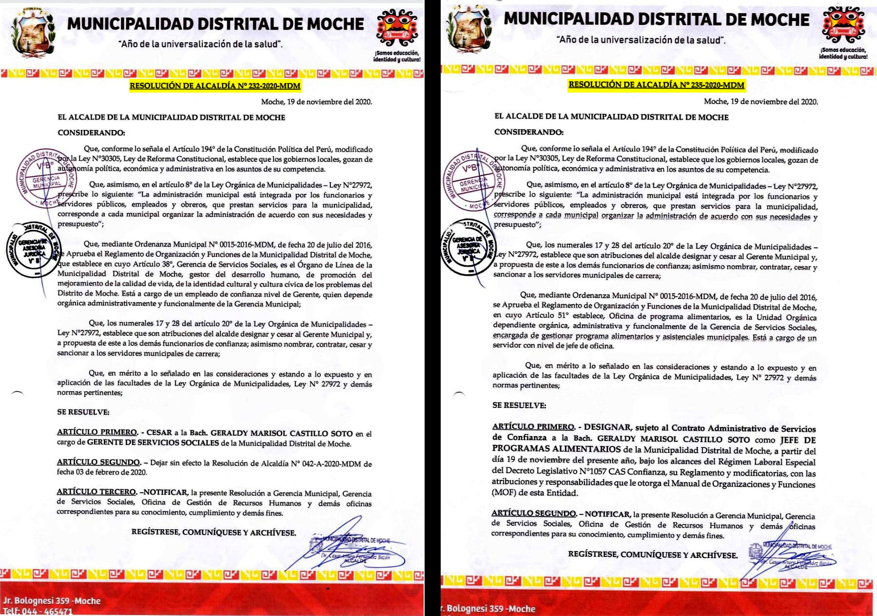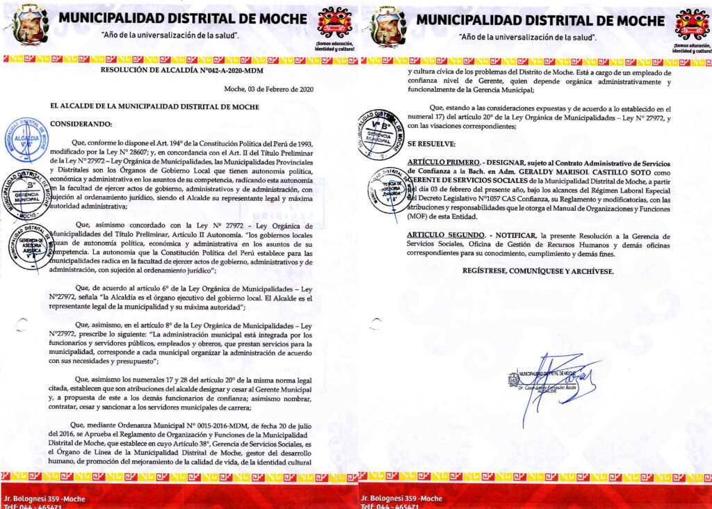 Es de señalar que a inicios de 2020 Castillo Soto fue designada mediante Resolución de Alcaldía N° 042-A-2020-MDM, como gerente de Servicios Sociales de la Municipalidad Distrital de Moche, el pasado 03 de febrero del citado año, durante la exgestión de Arturo Fernández.