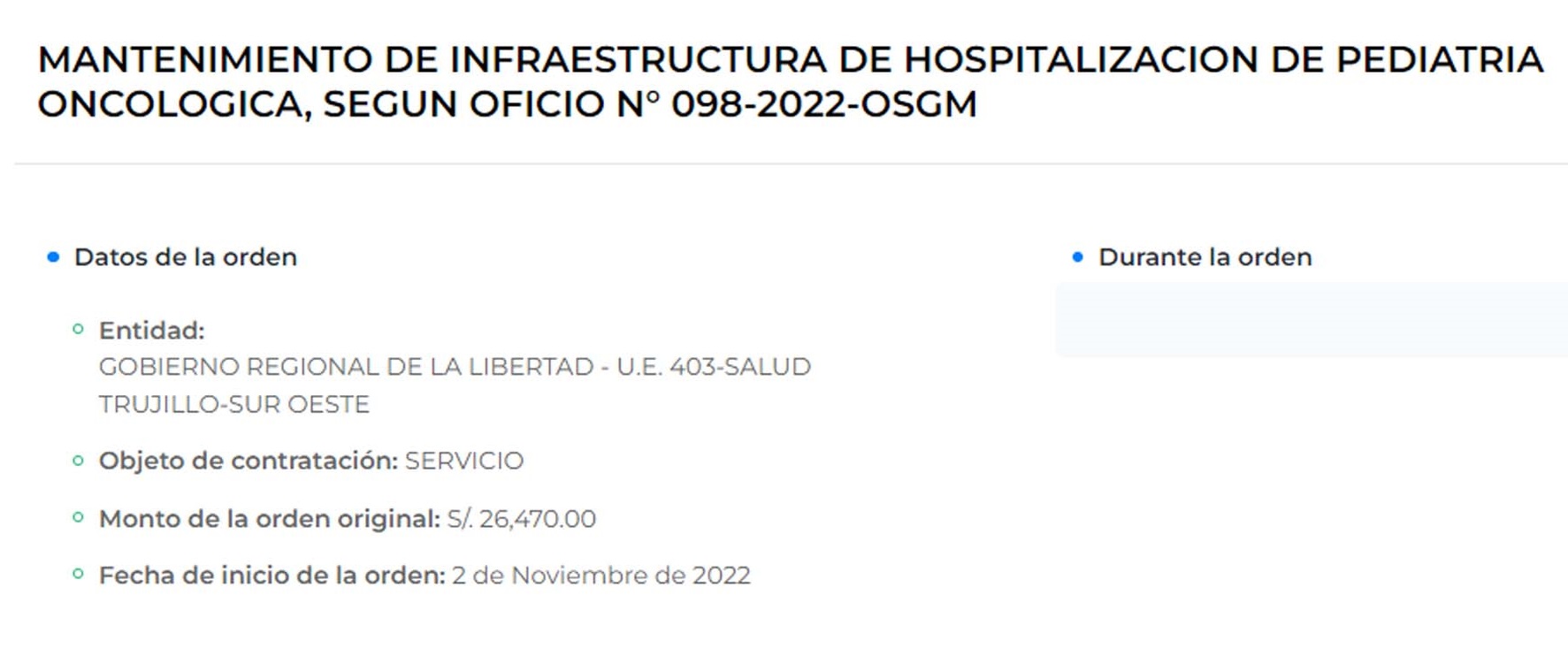 Además, el mismo año también se adjudicó 5 contratos por un total de S/ 36.070. Entre los que destacan los servicios de mantenimiento correctivo de techos protectores y cielo razo de almacenes y tópico de UCIN, acondicionamiento de la puerta de vidrio para archivador de melamine y el mantenimiento de infraestructura de hospitalización de pediatría oncológica.