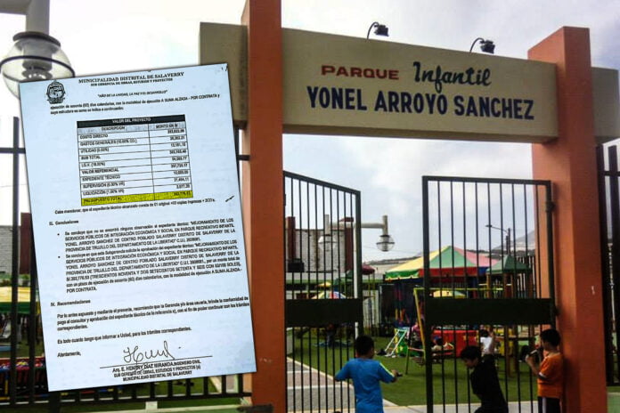 La regidora de la Municipalidad Distrital de Salaverry, Sandra Diaz Puglisevich, denunció una presunta sobrevaloración en la obra “Mejoramiento de los servicios públicos de integración económico y social del Parque Recreativo Infantil Yonel Arroyo Sánchez”, debido a que esta tenía como proyección de costo inicial S/136,488.41 (incluido los 10 mil soles de elaboración de expediente), sin embargo, pasó a costar S/392,776.63, es decir, tuvo un aumento de más de 200 mil soles.