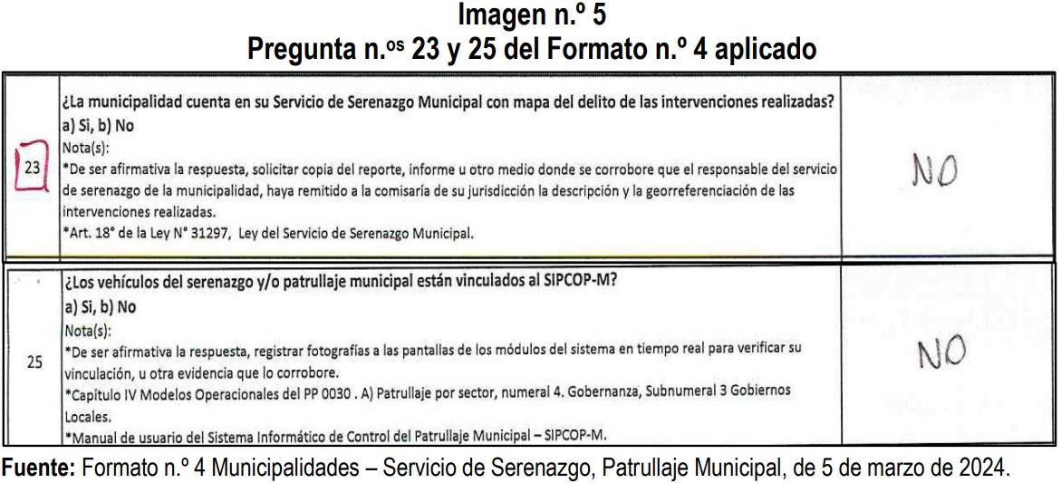 Finalmente, la Contraloría General de la República señala que “el servicio de serenazgo municipal no registró el formato de ocurrencias en el registro estandarizado de ocurrencias durante los años 2023 y 2024, de la misma forma, no brindó la información correspondiente para su ingreso en el registro nacional de serenos y serenazgo de la plataforma virtual del ministerio del interior, situación que pone en riesgo la priorización de acciones contra la delincuencia en las zonas de mayor incidencia delictiva, así como, una adecuada ejecución de estrategias sobre seguridad ciudadana según los perfiles y capacidades de los serenos municipales”.