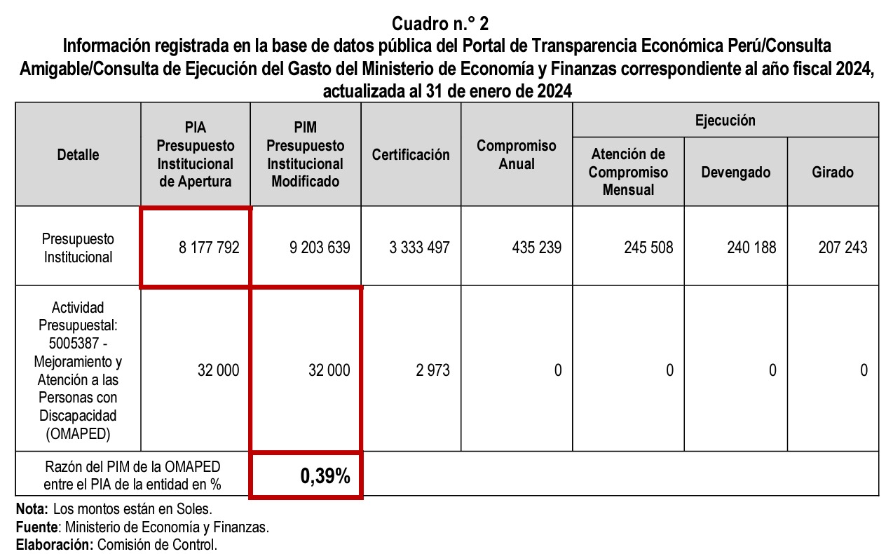 Cabe precisar que el citado municipio registra un PIA de S/ 8 177 792, correspondiente al año fiscal 2024, en ese sentido el dinero asignado para financiar las actividades de la OMAPED, es inferior al 0.5% normado por ley.