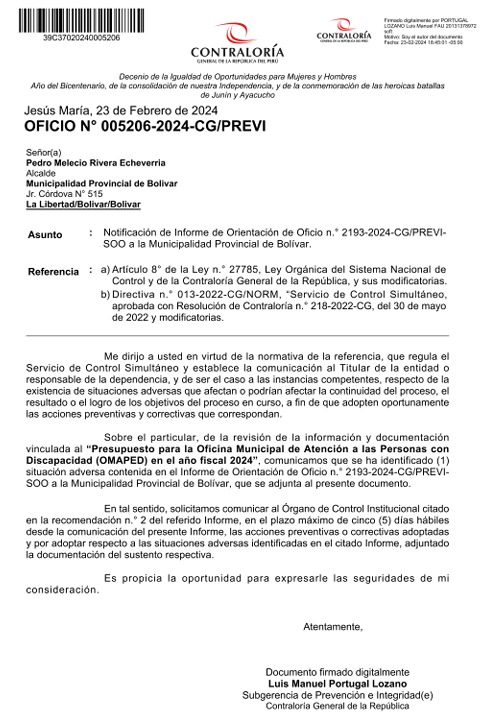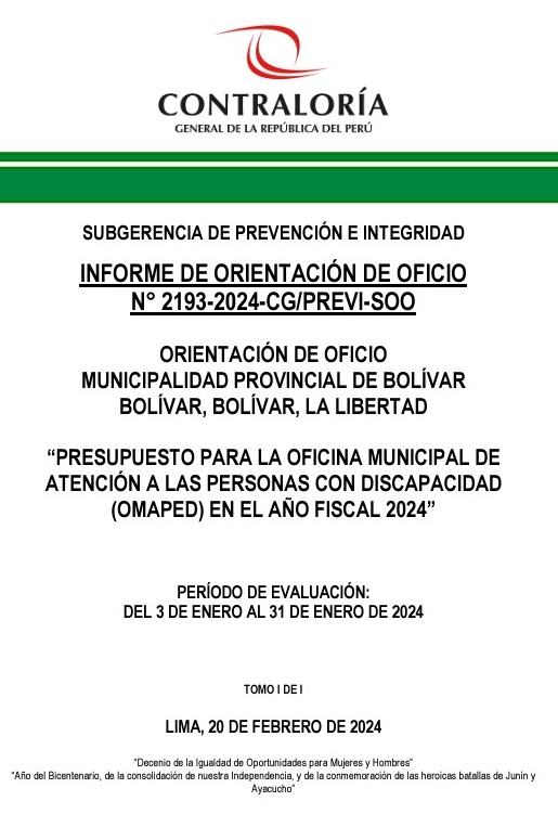 Lo detallado en este reporte periodístico obra en el Informe de Orientación de Oficio N° 2193-2024-CG/PREVI-SOO, elaborado por el órgano de control del 03 de enero al 31 de enero de 2024.