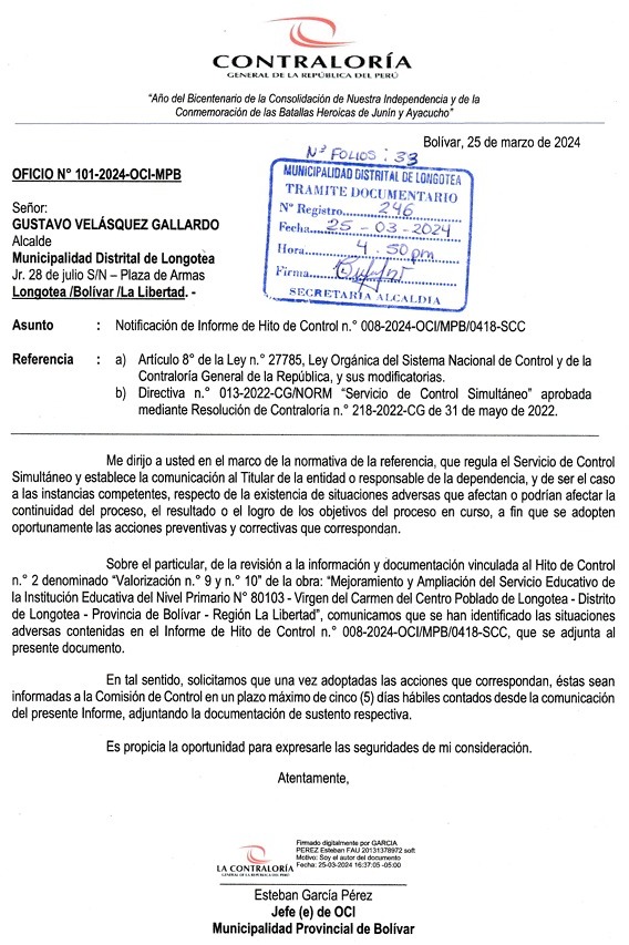 Lo detallado en este reporte periodístico obra en el Informe de Hito de Control N° 008-2024 OCI/MPB/0418-SCC, elaborado del 12 de marzo de 2024 al 18 de marzo de 2024, por el órgano de control .