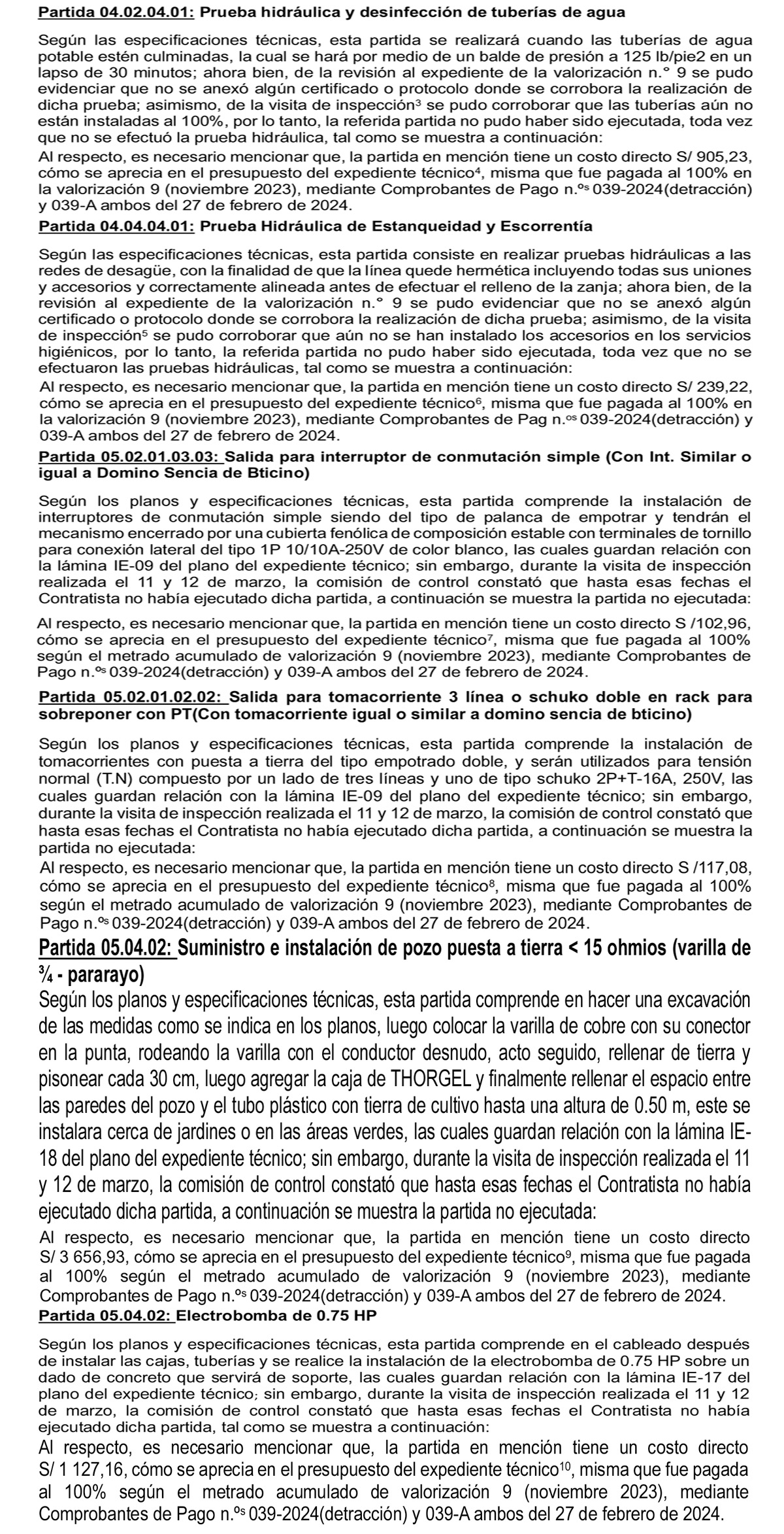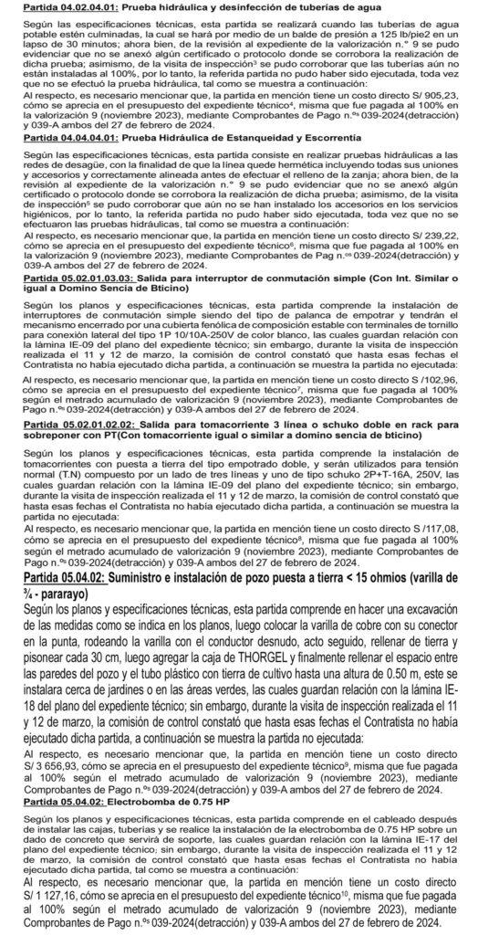 Sin embargo, la Contraloría General de la República corroboró entre los días 11 y 12 de marzo del año en curso, que algunas partidas consideradas en la citada valorización no fueron ejecutadas, estas observaciones fueron detalladas en el Acta de Inspección Física a Obra N° 004-2024-SCS-CC-COLEGIO LONGOTEA.
