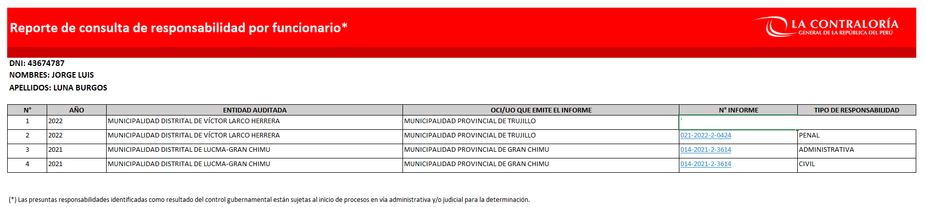 Por su parte, la Contraloría General de la República vincula a Jorge Luis Luna Burgos con irregularidades cometidas en la Municipalidad Distrital de Víctor Larco y la Municipalidad Distrital de Lucma. En los 4 informes del organismo auditor se le atribuyen 2 responsabilidades administrativas, 1 penal y 1 civil.
