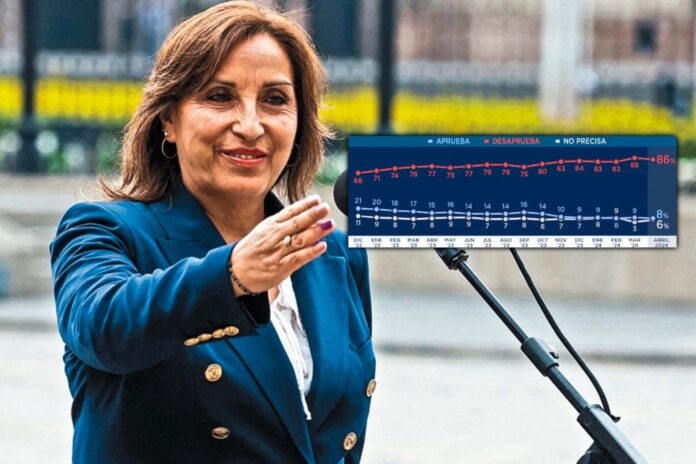La población la rechaza. Según la última encuesta realizada por Ipsos Perú, el gobierno de la presidenta de la República, Dina Boluarte, obtuvo un 86% de desaprobación. De acuerdo a las cifras de esta encuesta, solo un 8% de la población aprobó su desempeño como jefa de Estado desde diciembre de 2022 hasta el mes de abril de este año.