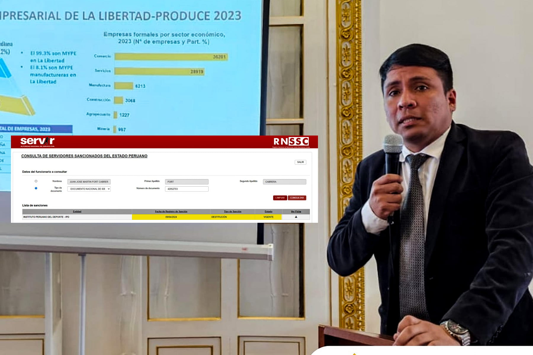 Según el Registro Nacional De Sanciones Contra Servidores Civiles (RNSCSC), Juan José Fort registra inhabilitación por cinco años para ejercer la función pública desde el 09 de abril del 2024, sanción que conllevaría que deje el cargo de gerente regional de Producción de La Libertad.