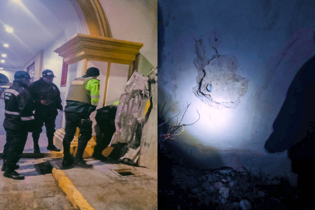 Al lugar se apersonó efectivos de la Policía Nacional del Perú, quienes en compañía de los serenos ingresaron al terreno contiguo de Caja Piura, donde verificaron que en la pared había un forado de aproximadamente 50 cm de circunferencia.