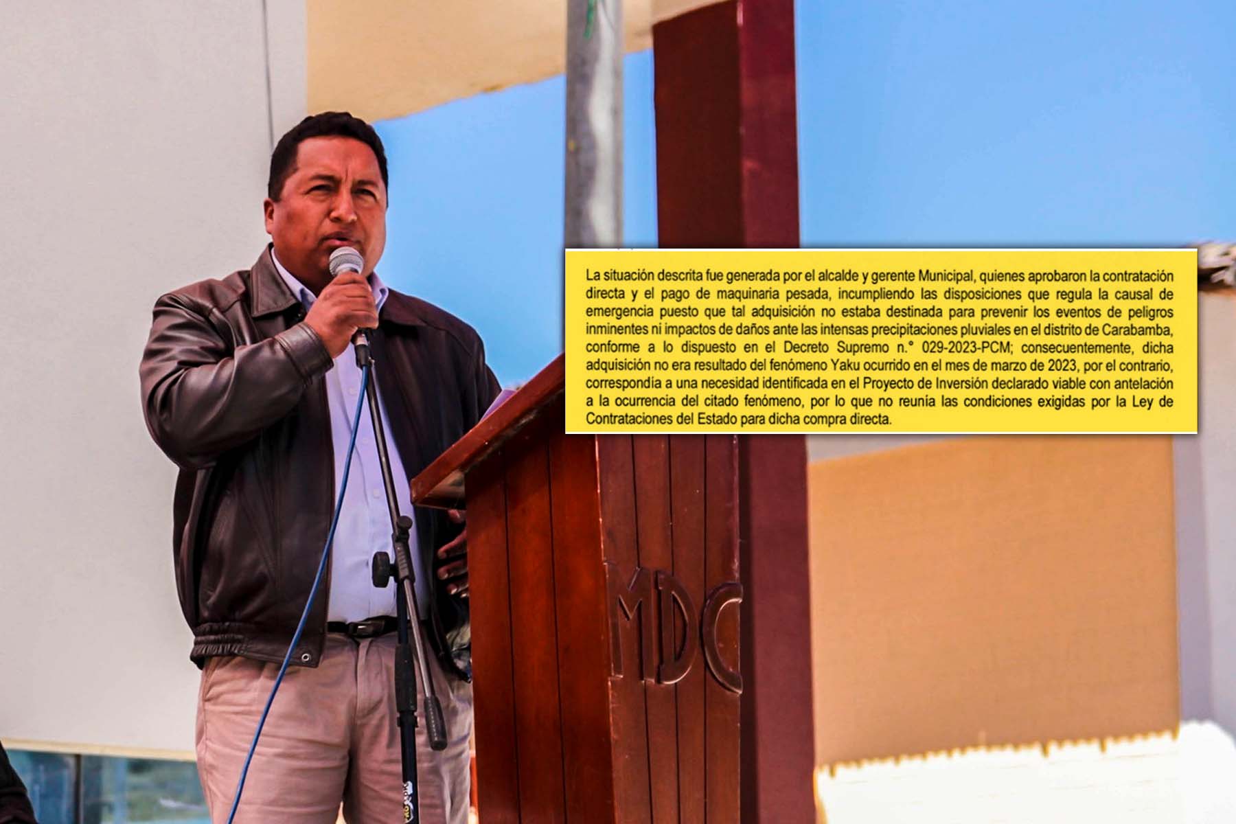 Para ello, el órgano de control presentó la Resolución de Alcaldía N°049-2023-MDC/A, de fecha 3 de mayo de 2023, donde la autoridad edil acepta la contratación directa de maquinaria pesada, incumpliendo sus deberes funcionales.