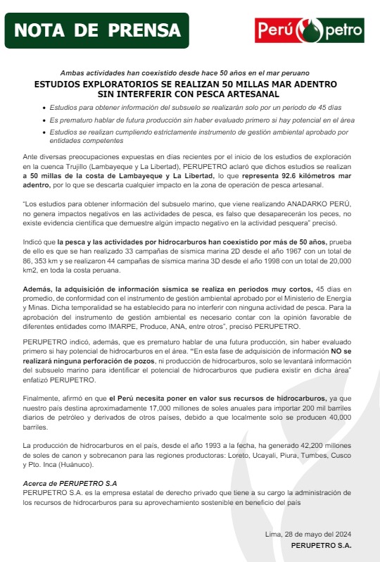 En el comunicado, Perúpetro señala que los estudios de exploración se están realizando en 50 millas de la costa de Lambayeque y La Libertad, lo que representa 92.6 kilometros mar adentro, descartando una afectación en la pesca artesanal, argumento que fue rechazado por William Puescas.