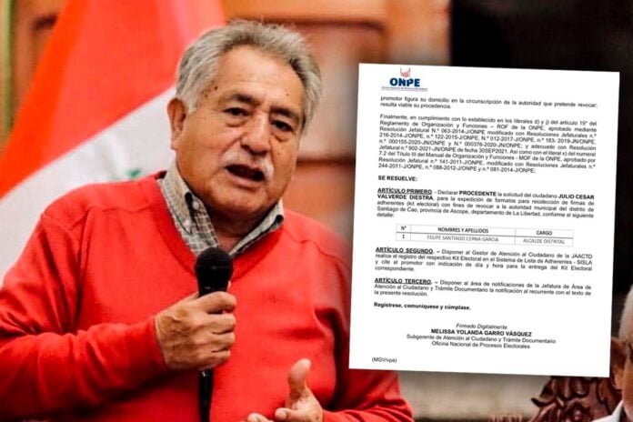 La Oficina Nacional de Procesos Electorales (ONPE), declaró procedente la solicitud de Julio Valverde Diestra para la adquisición del kit electoral a fin de revocar al alcalde distrital de Santiago de Cao, Felipe Cerna García.