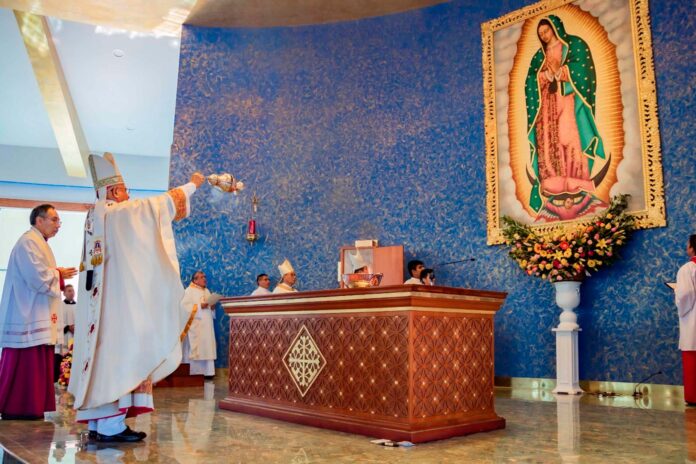 Mons. Miguel Cabrejos colocó las reliquias del Papa San Juan Pablo II en el altar. Luego ungió con el santo crisma el altar y las cruces de los muros del templo “Santa María de Guadalupe”. A continuación, incensó la imagen de la Virgen de Guadalupe y la escultura del Cristo Crucificado.