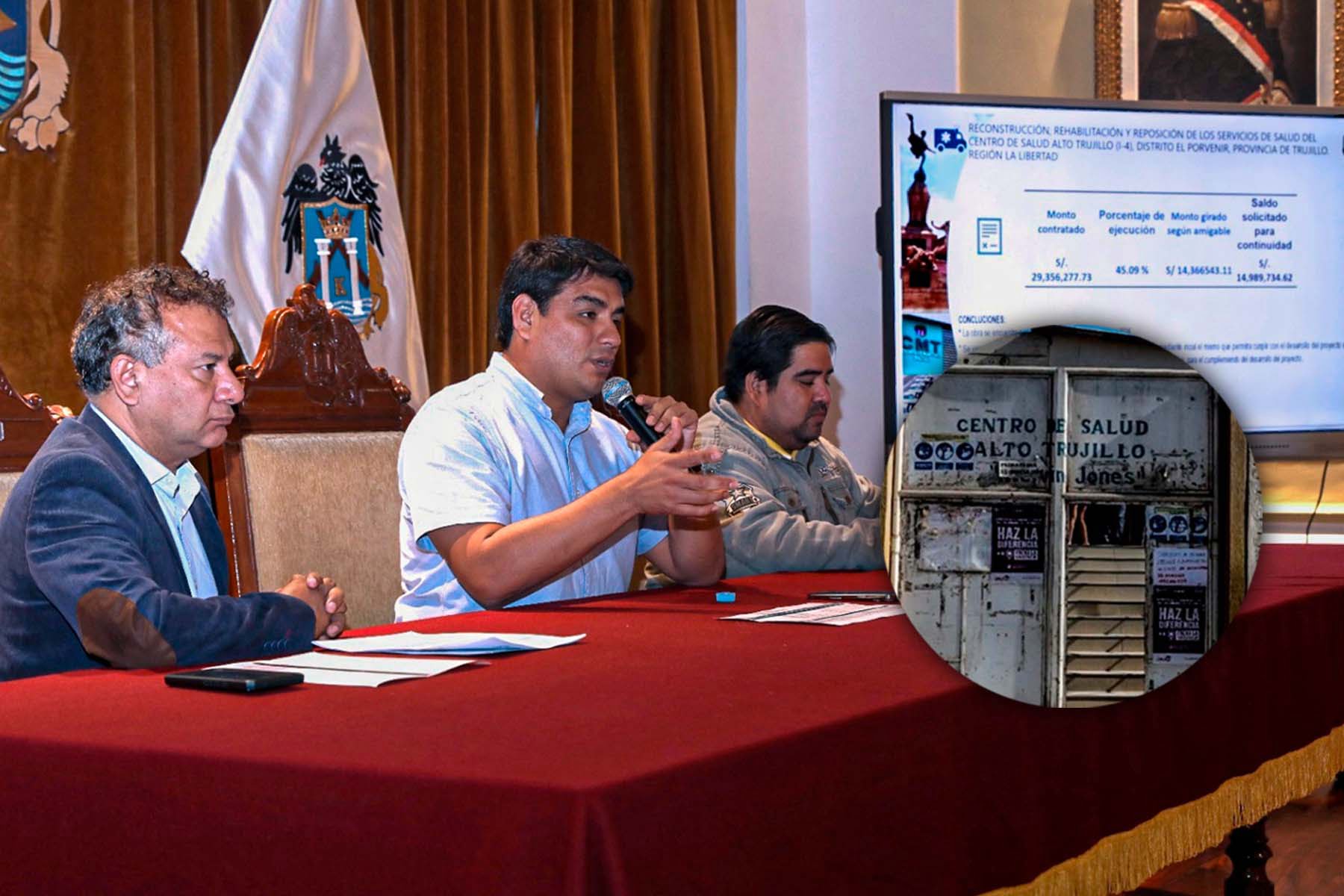 El alcalde de Trujillo, Mario Reyna Rodríguez, se reunió con el presidente del Consejo Regional de La Libertad, Ever Cadenillas, funcionarios de la Red de Salud y dirigentes de Alto Trujillo, para abordar la problemática de la obra del Centro de Salud Melvin Jones, la cual quedó paralizada desde el 22 de marzo del presente año.