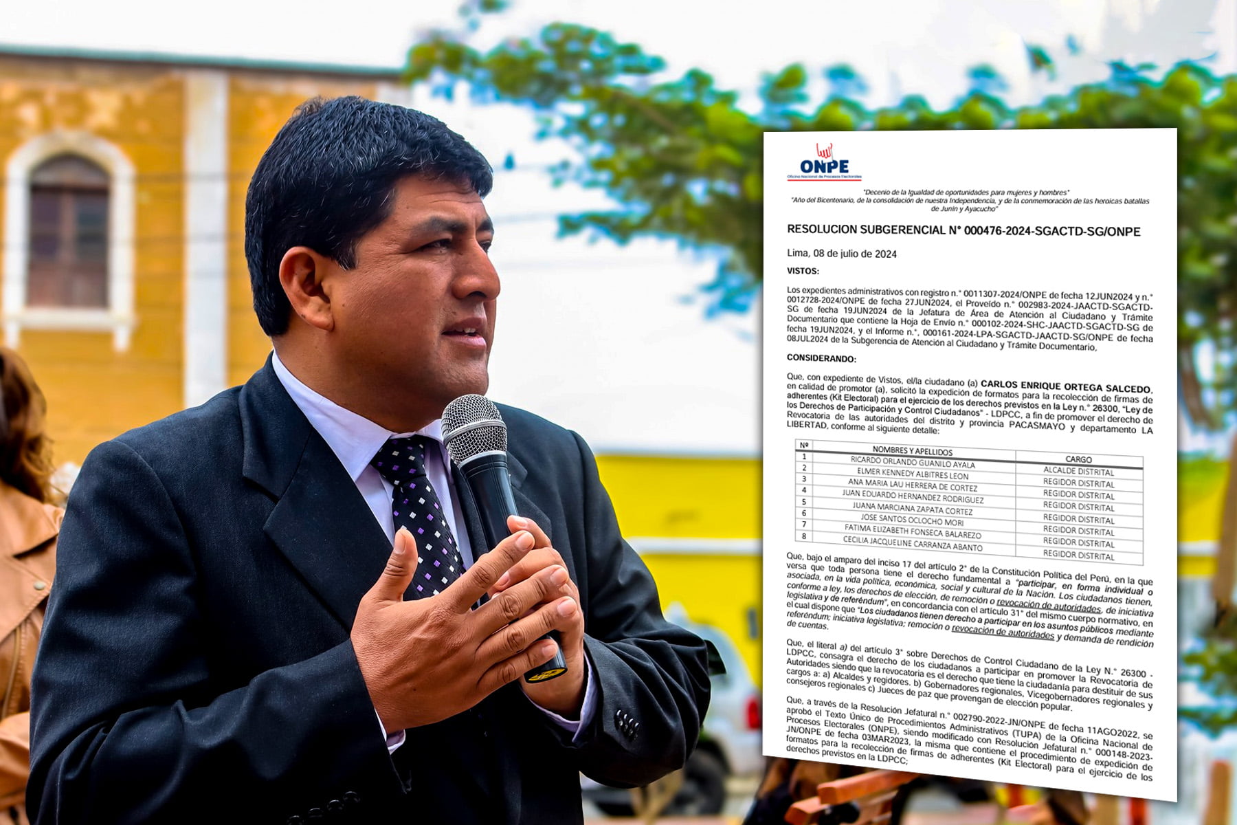 La Oficina Nacional de Procesos Electorales (ONPE), mediante Resolución Subgerencial N° 476-2024-SGACTD-SG/ONPE, declaró procedente la solicitud de Carlos Enrique Ortega Salcedo para adquirir el kit electoral de revocatoria contra el alcalde del distrito de Pacasmayo, Ricardo Orlando Guanilo Ayala.
