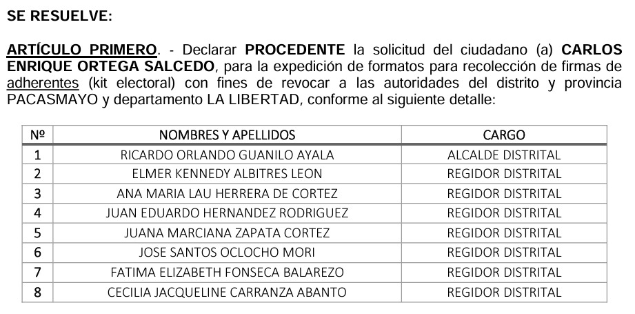 “Declarar procedente la solicitud del ciudadano Carlos Enrique Ortega Salcedo, para la expedición de formatos para recolección de firmas de adherentes (kit electoral) con fines de revocar a las autoridades del distrito y provincia Pacasmayo y departamento La Libertad”, señala la citada resolución.