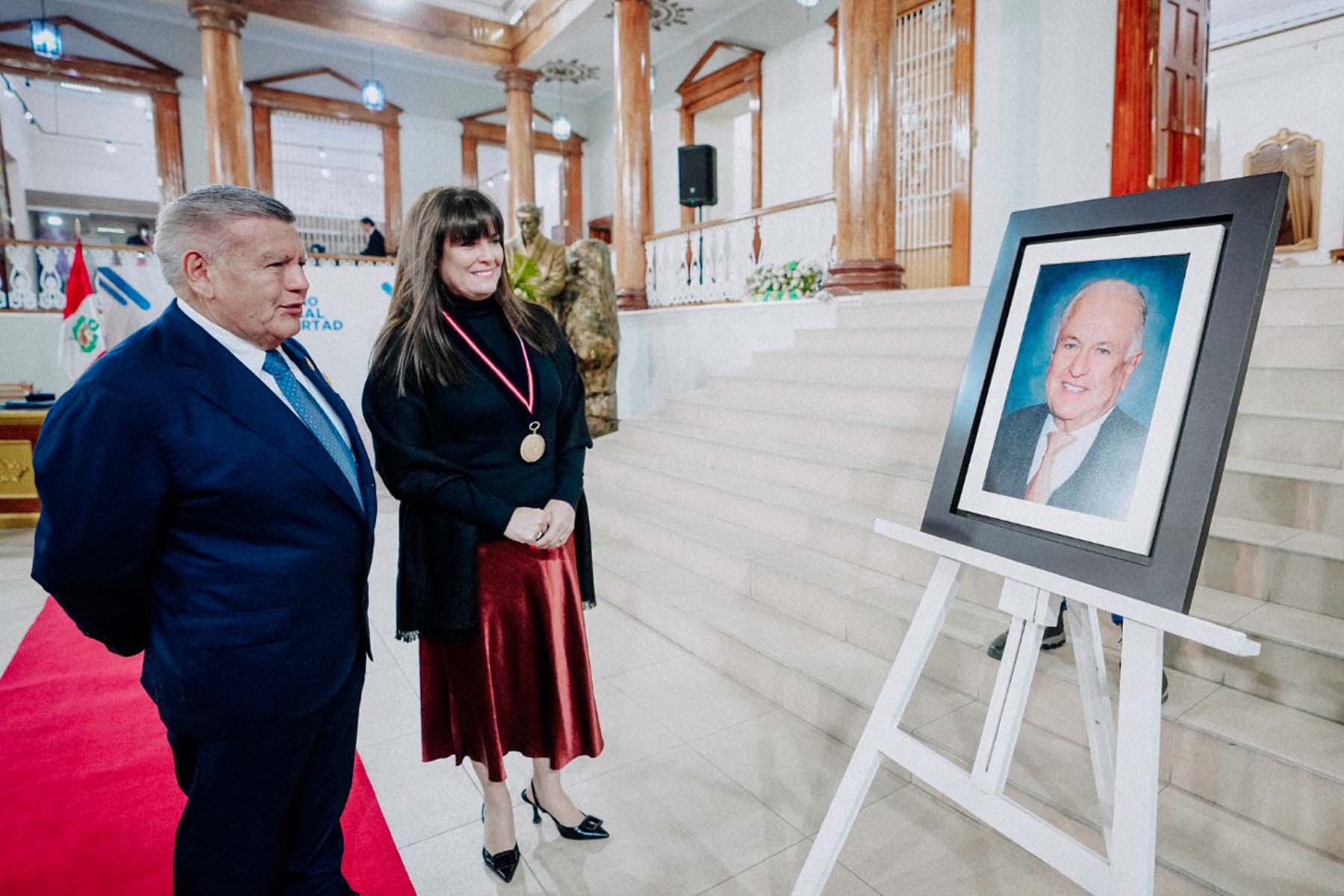 El gobernador regional César Acuña, en solemne ceremonia, impuso la Medalla de la Libertad a su hija Rocío Quevedo, y le entregó la resolución ejecutiva, la cual resalta los méritos para tal distinción.