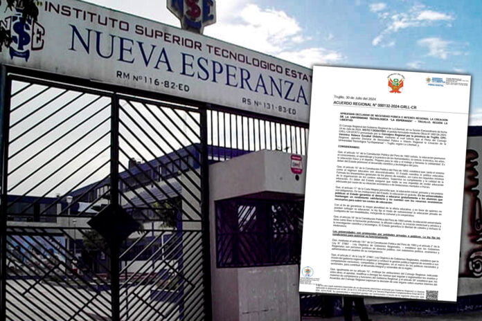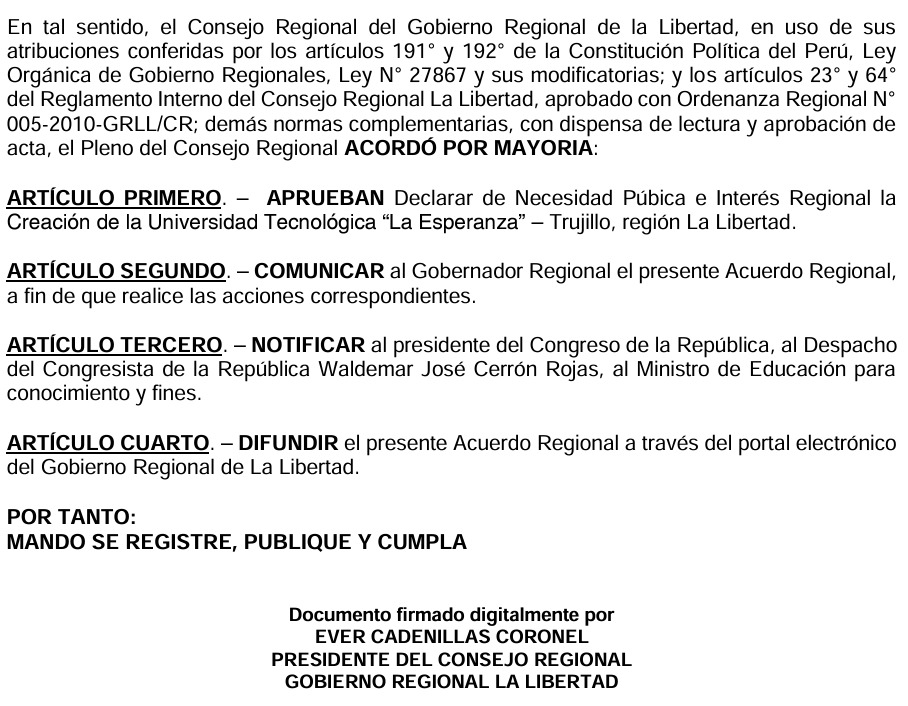 El Consejo Regional de La Libertad (CRLL), mediante Acuerdo Regional N° 132-2024-GRLL-CR, declaró de necesidad pública y regional la creación de la Universidad Tecnológica “La Esperanza”, en Trujillo.