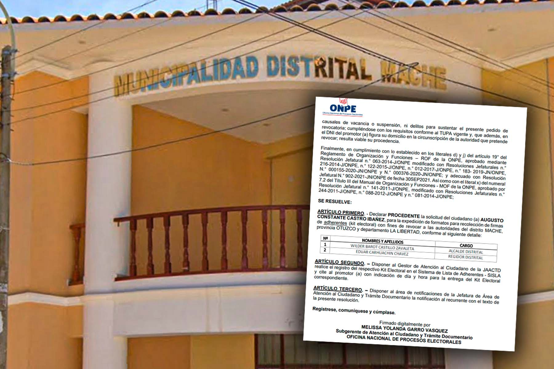 “Declarar procedente la solicitud del ciudadano Augusto Constante Castro, para la expedición de formatos para recolección de firmas de adherentes (kit electoral) con fines de revocar a las autoridades del distrito Mache, provincia Otuzco y departamento La Libertad”, señala la citada resolución.
