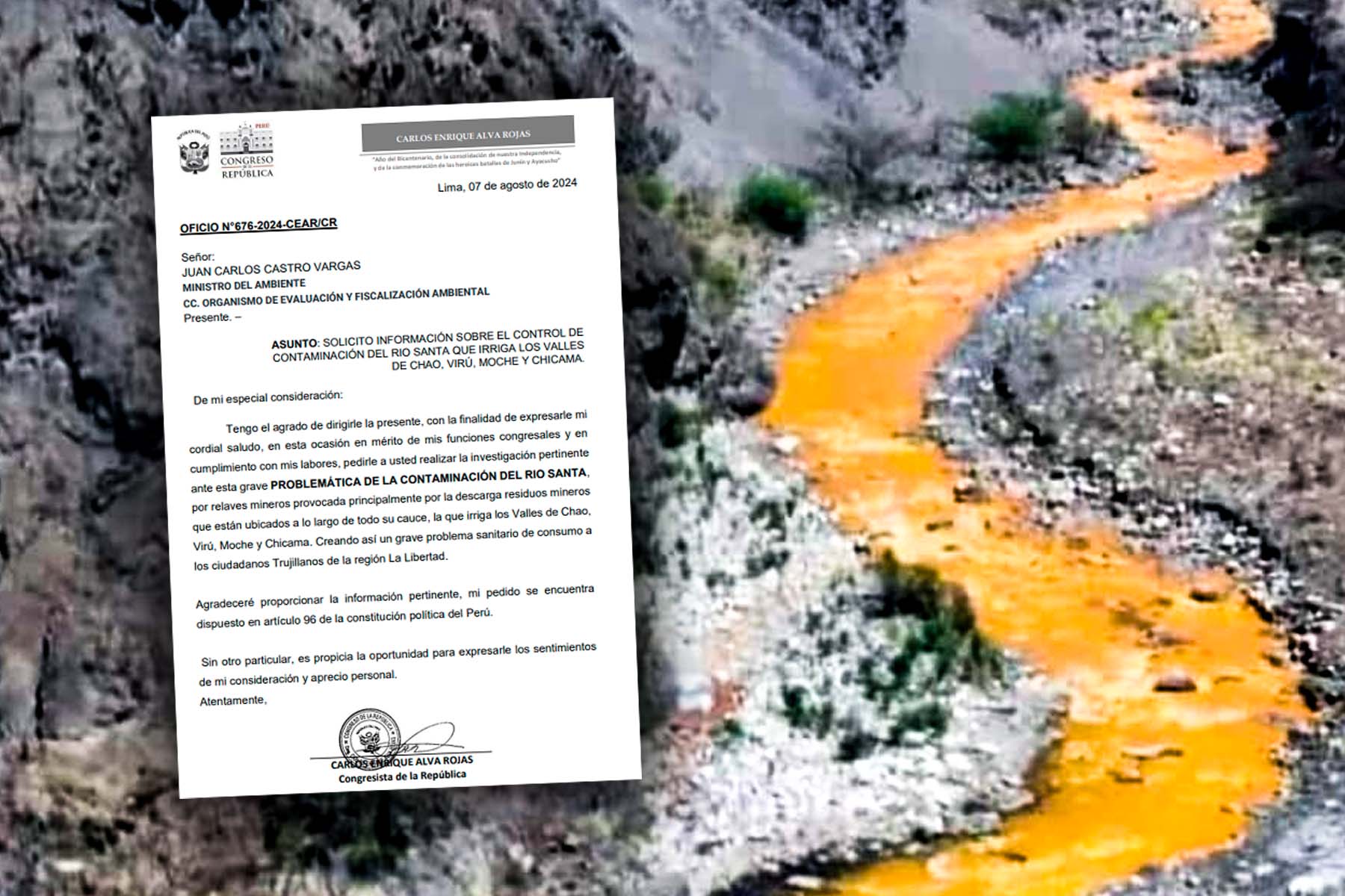 Mediante Oficio N°676-2024-CEAR/CR, el congresista Enrique Alva solicitó al ministro del Ambiente, Juan Carlos Castro, iniciar las investigaciones correspondientes luego de darse a conocer la contaminación que sufrió el río “Pelagatos”, en el sector Tablachaca, en la provincia de Ancash, que es afluente del río Santa , el mismo que abastece a la Planta de Tratamiento de Agua Potable de la región.