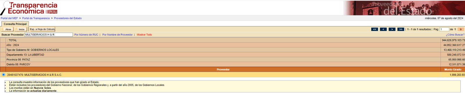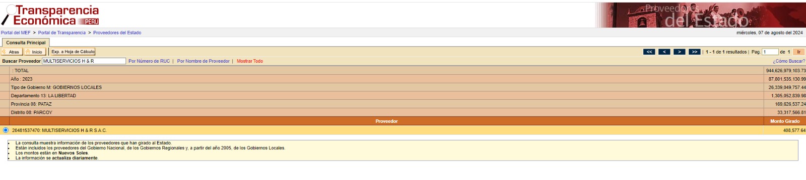 Cabe precisar que, según el portal de Transparencia Económica del Ministerio de Economía y Finanzas (MEF), durante el 2023 y 2024, la Municipalidad Distrital de Parcoy pagó S/ 408,577.64 y S/ 1,099,283.99, respectivamente, a la empresa Multiservicios H&R.