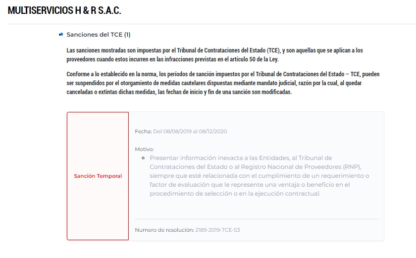 Es de señalar que en el 2019, la citada empresa fue sancionada con la inhabilitación temporal por el Tribunal de Contrataciones del Estado, durante un periodo de 36 meses, luego de identificarse que presentó documentación falsa en un proceso de licitación.