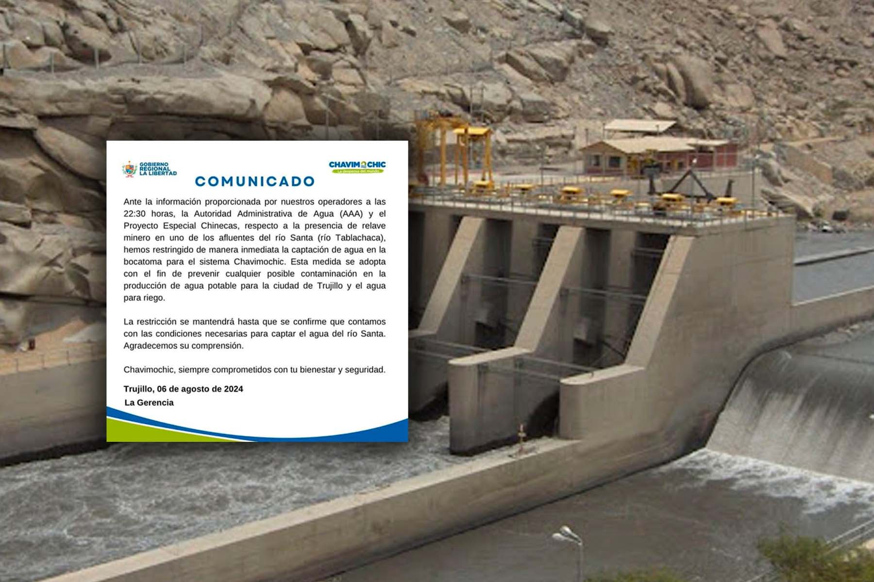 Mediante un comunicado, el Proyecto Especial Chavimochic (PECH) dio a conocer que desde las 22:30 p.m. del martes 6 de agosto, han restringido la captación de agua en la bocatoma para el sistema del citado proyecto.