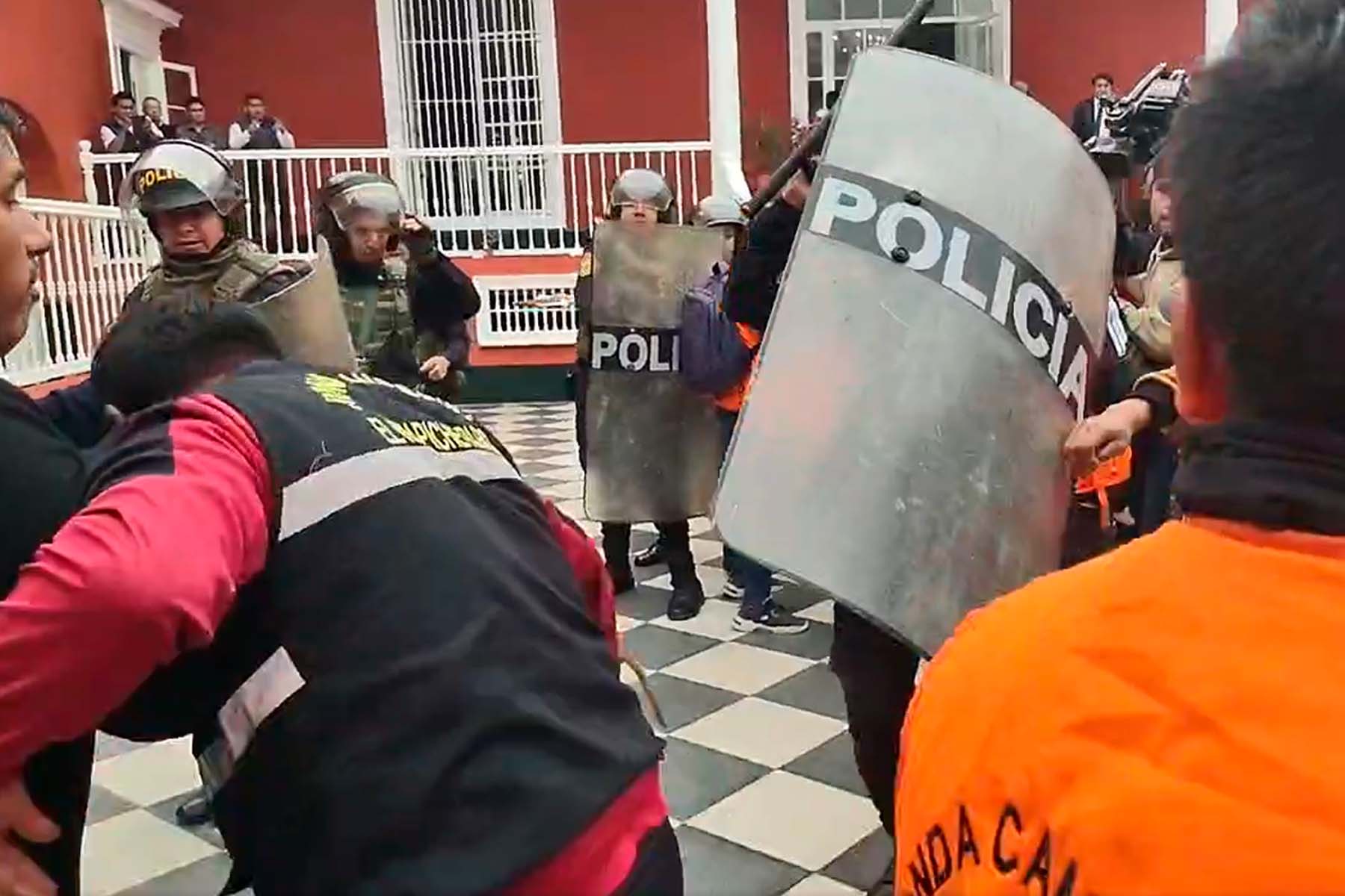 Esta situación ocasionó que los agentes policiales resguarden todo el perímetro y utilicen sus escudos para evitar que los pobladores continúen avanzando, ocasionando un enfrentamiento que dejó más de dos personas heridas.