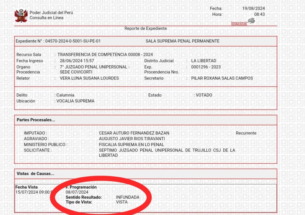 En respuesta a ello, La Sala Suprema Penal Permanente de la Corte Suprema declaró infundado el pedido del ahora reo contumaz Fernández Bazán, quien alegaba una presunta parcialización de los jueces liberteños, esto habría tenido como fin seguir dilatando sus procesos judiciales.