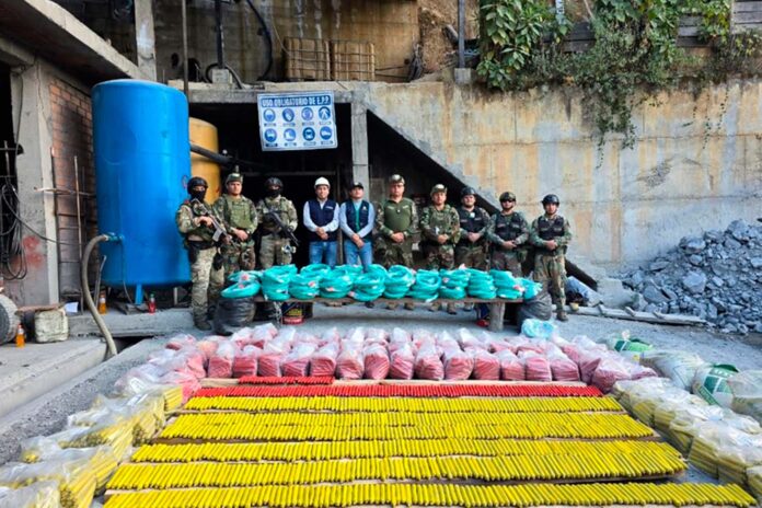 Entre el material incautado también figuran tres cargas explosivas, 10 sacos de plástico con anfo, un cernidor, más de 8,600 cartuchos de emulsión, 5,400 detonadores ensamblados, 10 carritos mineros, 50 toneladas de desmonte.