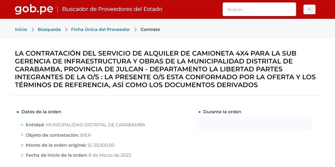Entre las ordenes adjudicadas en el citado municipio destaca la “contratación del servicio de alquiler de camioneta 4×4 para la subgerencia de Infraestructura y Obras de la Municipalidad Distrital de Carabamba, provincia de Julcán – departamento La Libertad”, por un valor de 33 mil soles.