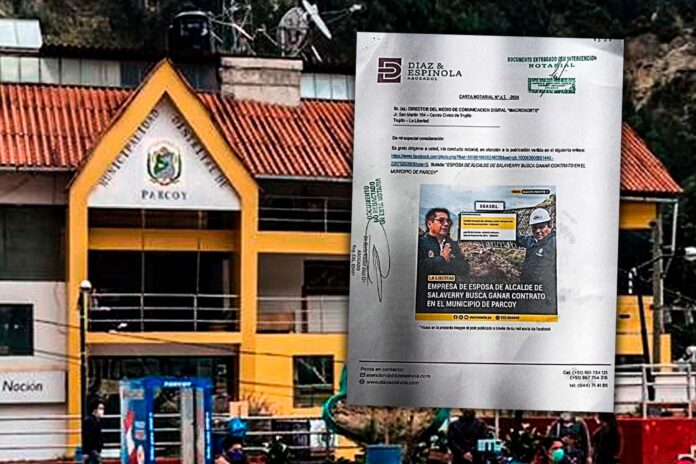 No obstante, lo antes indicado es totalmente falso, debido a que este medio de comunicación digital no manifestó que la citada esposa del alcalde de Salaverry estaría buscando obtener un contrato de la comuna de Parcoy, si no, se mencionó que la empresa SGA S.R.L. se encuentra participando y buscando adjudicarse la buena pro de la licitación y se informó que una de las socias de esta persona jurídica es la esposa de la autoridad edil trujillana.