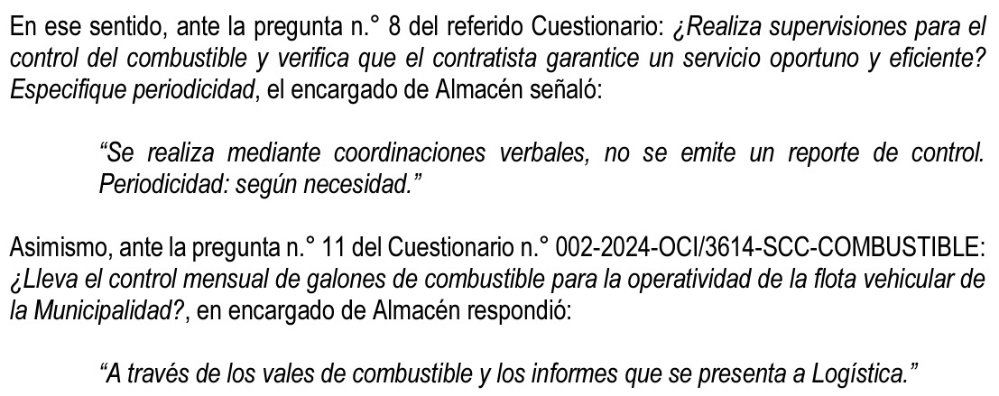 “Se advierte que la Entidad no cuenta con alguna directiva u otro documento de gestión interno aprobado que establezca el proceso de distribución y control del combustible; más aún cuando existen situaciones de regularización, las cuales deberían desarrollarse bajo el marco de un procedimiento establecido.  Asimismo, el personal responsable a cargo de autorizar el abastecimiento del combustible a las unidades vehiculares y motorizadas de la entidad, no emite reportes de control y supervisión que aseguren la eficiente distribución del combustible; tampoco, consolida la información contenida en los vales de despacho de combustible”