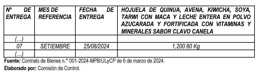 La Municipalidad Provincial de Bolívar, bajo la dirección del alcalde Melecio Rivera, el pasado 06 de marzo del año en curso firmó contrato con la empresa MOLINERA BLANQUITA S.A.C. para la compra de “Hojuela de quinua, avena, kiwicha, soya, tarwi con maca y leche entera en polvo azucarada y fortificada con vitaminas y minerales sabor clavo canela”, para los meses de marzo a diciembre de 2024, por un monto contractual de S/103 371, correspondiente al Programa Vaso de Leche.