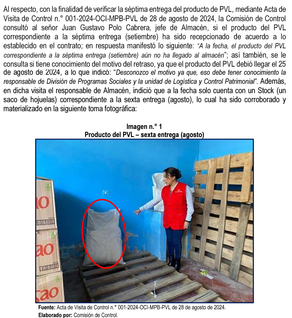 “En consecuencia, el producto de PVL correspondiente a la séptima entrega (setiembre) a la fecha de la visita aún no había llegado al almacén de la Entidad, pese a que la fecha de recepción fue el 25 de agosto de 2024, comprobándose con ello el retraso de tres (3) días hábiles por parte del proveedor”